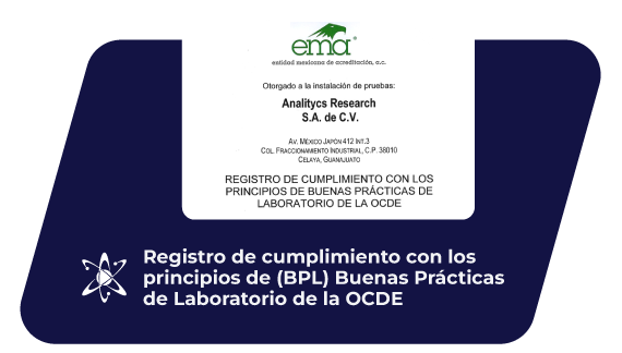 Laboratorio con certificación del cumplimiento a los principios de buenas prácticas de laboratorio (BPL) emitidos por la OCDE y reconocidos internacionalmente.